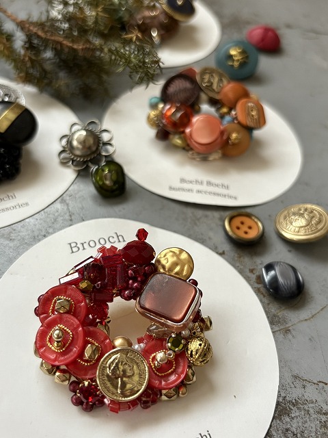 | オススメ商品のこだわりポイント | デッドストックになった個性的なボタンを組み合わせて、コーディネートのアクセントになるブローチ、ピアス、イヤリングに仕立てました |