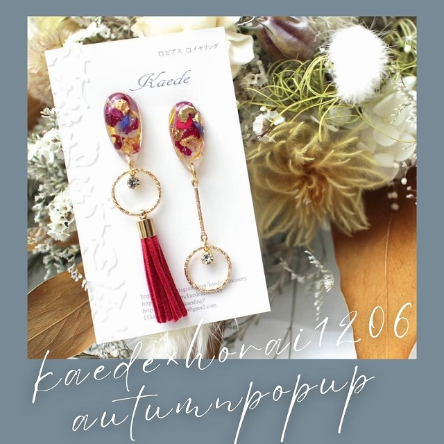| オススメ商品のこだわりポイント | 本物のお花を使用したアクセサリーは世代を問わず人気で、こだわりのタッセルと合わせ他と被らない唯一無二なデザインに仕上げております。ピアスやイヤリング、アレルギー対応金具へも全て無料で交換いたします♪ |
