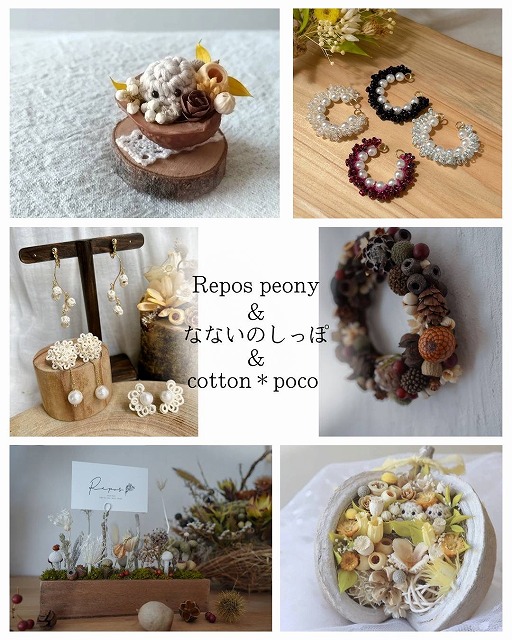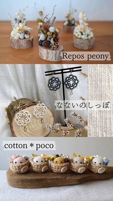 | オススメ商品のこだわりポイント | 小さく繊細なタティングレースやウッドビーズアクセサリー、かぎ針編みヘアアクセサリー、ブッダナッツやくるみの殻を使ったコットン糸のまんまるなpocoのアレンジ作品、暮らしに取り入れやすい季節の草花作品など、ちょっとした小さな幸せをお届けします |