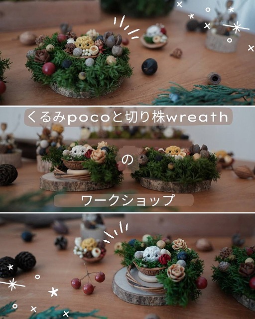 | ワークショップ | くるみpocoと切り株wreathのワークショップ/好きな色や素材のくるみpocoと切り株wreathを選んで、グリーンのwreathに木の実や草花のかけらをボンドで付けてデザインしていただきます!沢山の木の実や草花のかけらから、あなたの好きを詰め込んだオリジナルの置き型wreathを作ってもらえるワークショップです!/約15分/¥1,400~ |