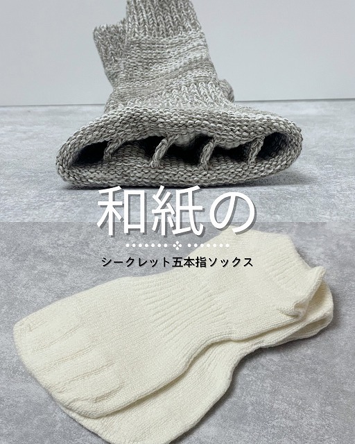 | オススメ商品のこだわりポイント | 5本指が好き。でも靴を脱ぐとき実はちょっと恥ずかしい。そんなプチ悩みを解決する靴下です。和紙は吸湿放湿性があるから蒸れにくく、汗かいてもすぐ吸って、乾きも早い!残糸を使っているので数に限りはありますので、お早めに。 |
