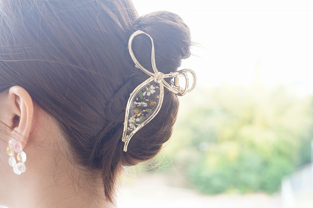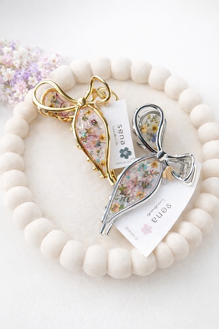 | オススメ商品のこだわりポイント | 本物のお花を閉じ込めたリボンバンス。華やかで上品なデザインながら、しっかり髪をまとめられる実用性も魅力です。大人可愛いスタイルにぴったりの人気アイテムです。 |