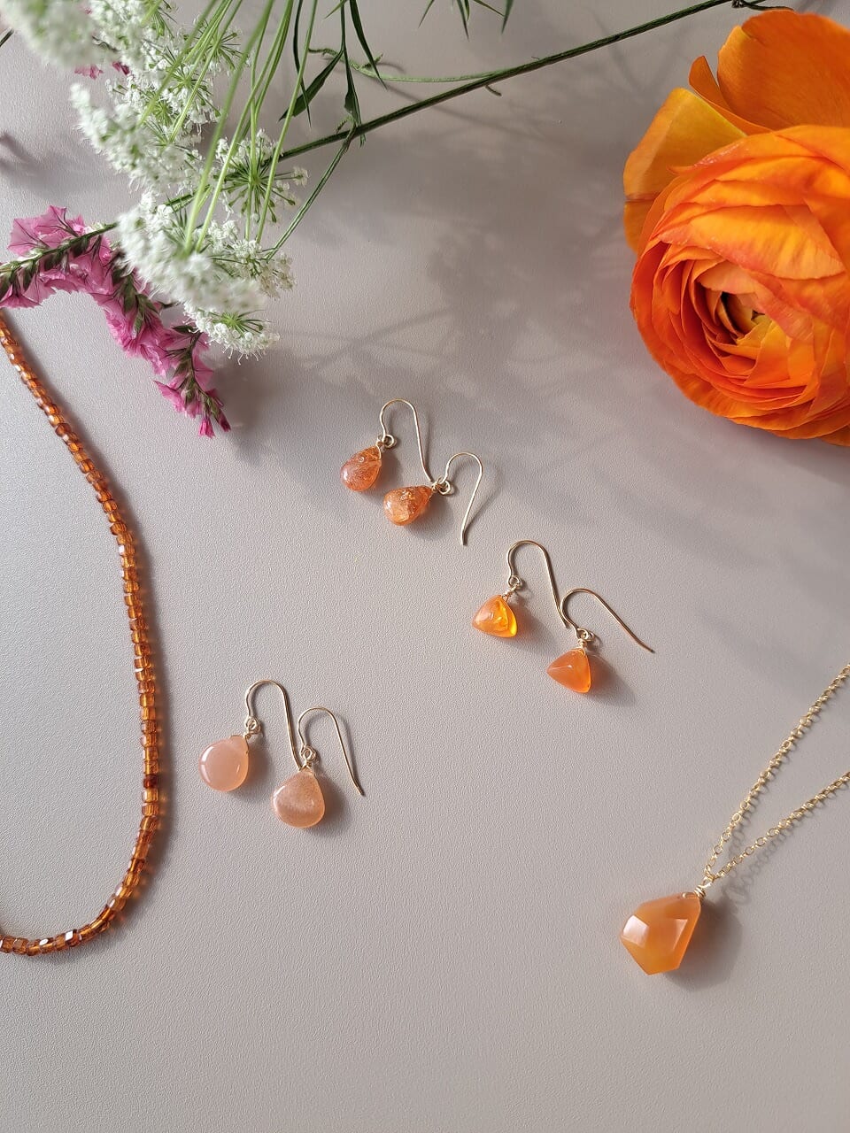 | オススメ商品のこだわりポイント | やわらかなオレンジカラーの天然石を、シンプルで上品に仕立てました。光にふれて静かにきらめく姿は、大人の女性の装いにそっと寄り添います。金属アレルギーにも配慮した、毎日安心して楽しめる優しいアクセサリーです。 |