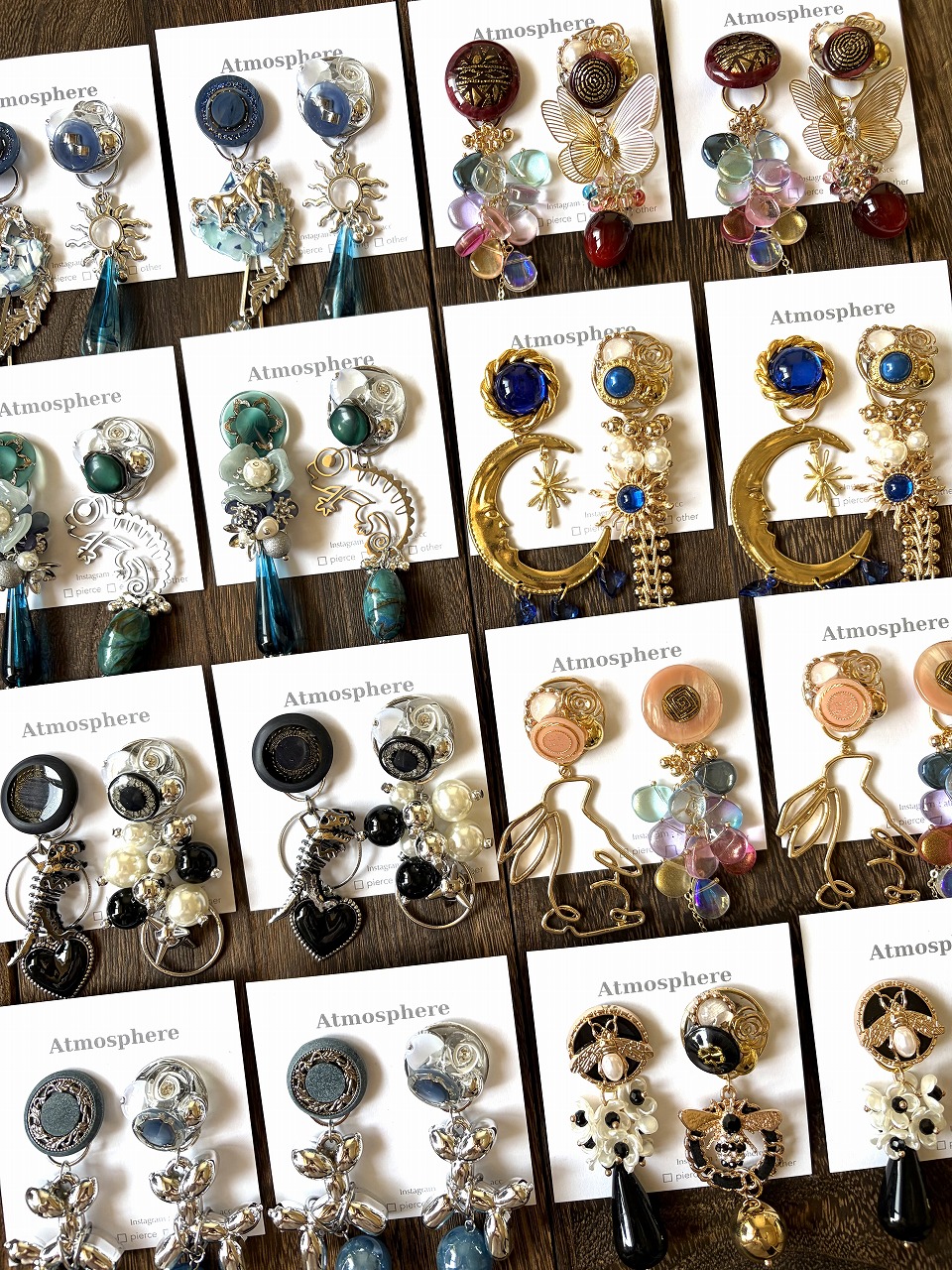 Atmosphereではボタンを使ったハンドメイドアクセサリーを制作しています。アンティークボタンやインポートボタンをトップに、取り外し可能なアシンメトリーチャームを合わせたピアスやイヤリングを100種類以上のデザインでご用意しております。