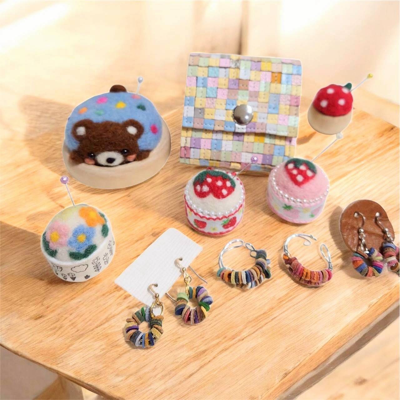 | オススメ商品のこだわりポイント | 手描きイラストの温かみ、独特な風合いを感じながら仕上げております。本皮からパーツを一つづつ作り完全オリジナル商品を作り上げております。羊毛フェルトを使用し、ペットボトルの蓋を使用した針山を作っております。 |
