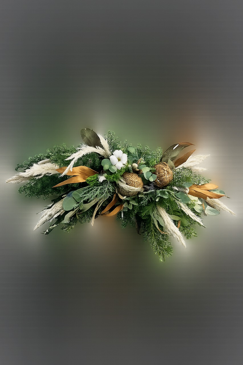 | オススメ商品のこだわりポイント | 季節のグリーンやドライ素材を使った、ナチュラルなリースとスワッグ。一点一点手作業で仕上げた、同じものが二つとない作品です。お部屋や玄関に自然の温もりを届けます。 |