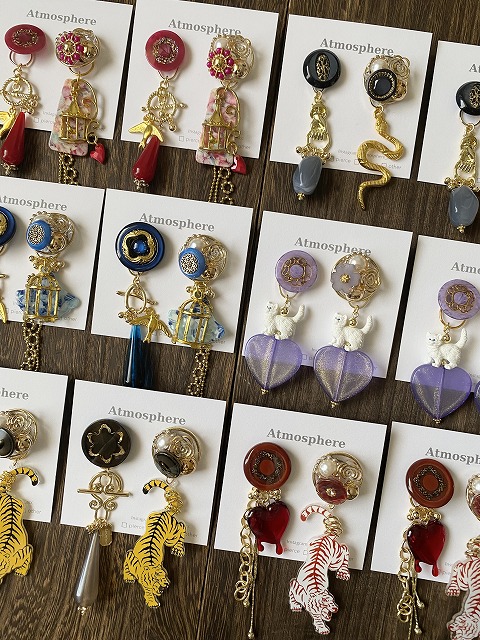 | オススメ商品のこだわりポイント | Atmosphereではボタンを使ったハンドメイドアクセサリーを制作しています。アンティークボタンやインポートボタンをトップに、取り外し可能なアシンメトリーチャームを合わせたピアスやイヤリングを100種類以上のデザインでご用意しております。 |