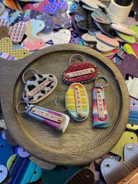 オススメ商品のこだわりポイント | 1000種類以上の中からお好みの革を選んでいただき、その場でお客様のお名前刻印した革製キーホルダーを1個90秒でお作りいたします。 |