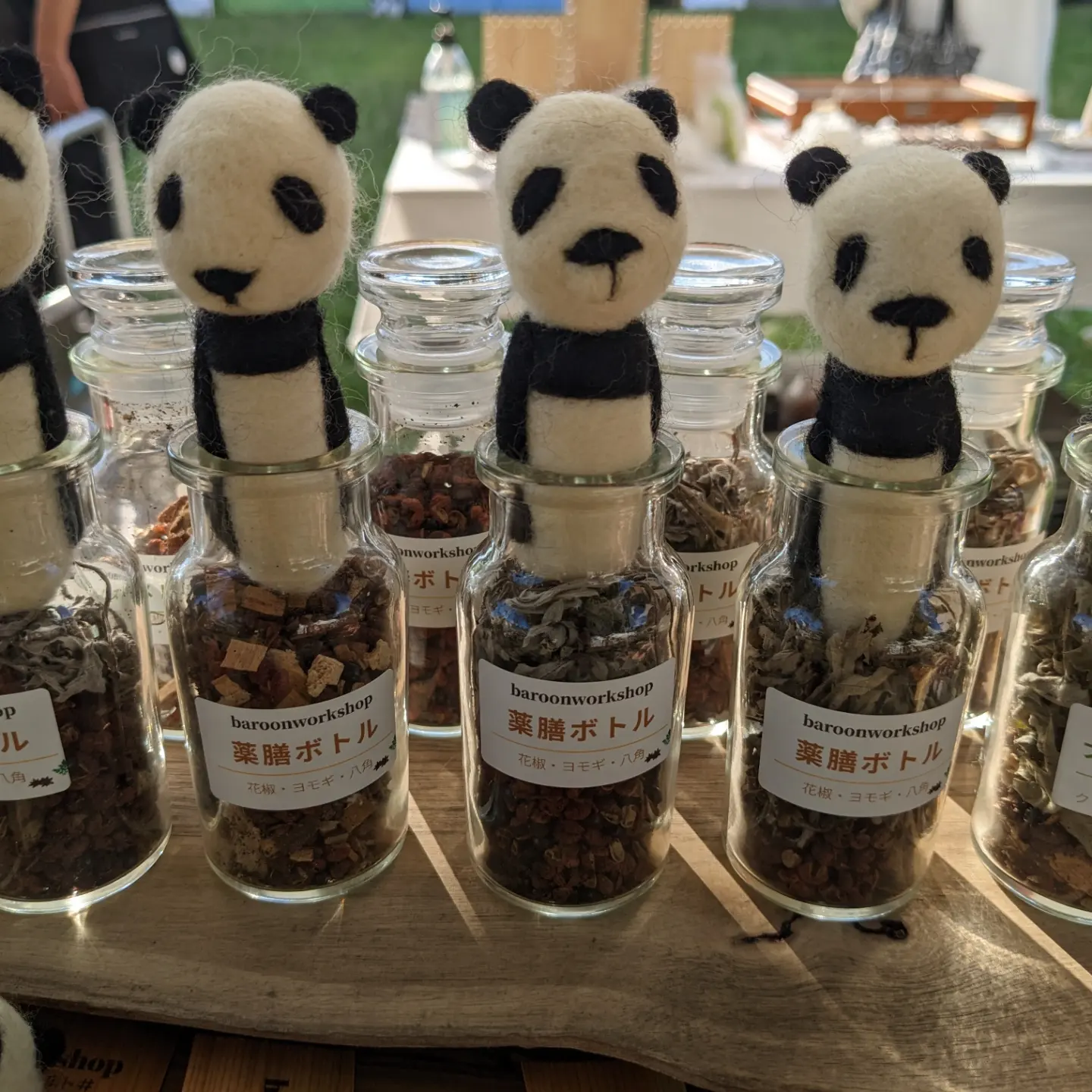 | オススメ商品のこだわりポイント | 薬草ハーブの詰まったガラス瓶と羊毛クラフトで作ったパンダたちの蓋付き!インテリアとして飾ったり、瓶の中の薬草ハーブの香りを楽しんだり、用途は色々楽しめます。 |