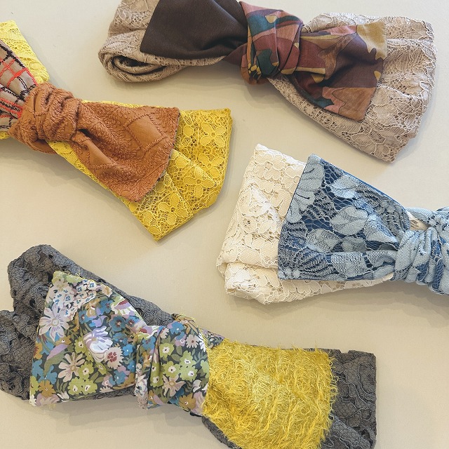 オススメ商品のこだわりポイント | 尾州やでデットストックの生地、アンティークな生地、布の組み合わせ、ひとつひとつこだわってヘアターバンを作ってます。シンプルなターバンに好みのリボンをつけるスタイルで個性的なターバンにアレンジできます。リボンはトップ、サイド、襟足にもつけてもステキです。 |