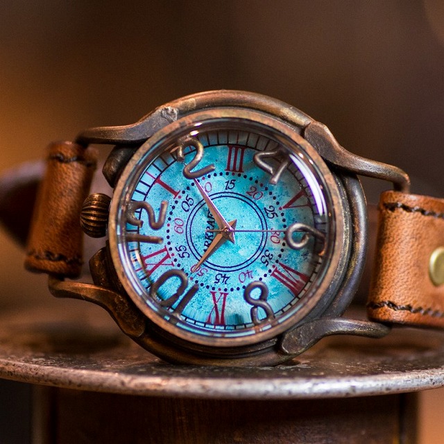 | オススメ商品のこだわりポイント | 海のような綺麗な青の時計をイメージして製作した作品です。青い色は銅紛を文字盤に塗りアンモニアで錆びさせて緑青を出し色付けしています。またワイヤーを曲げたアラビア数字と文字盤に印刷した赤いローマ数字の組み合わせも特徴の大き目の作品です。 |
