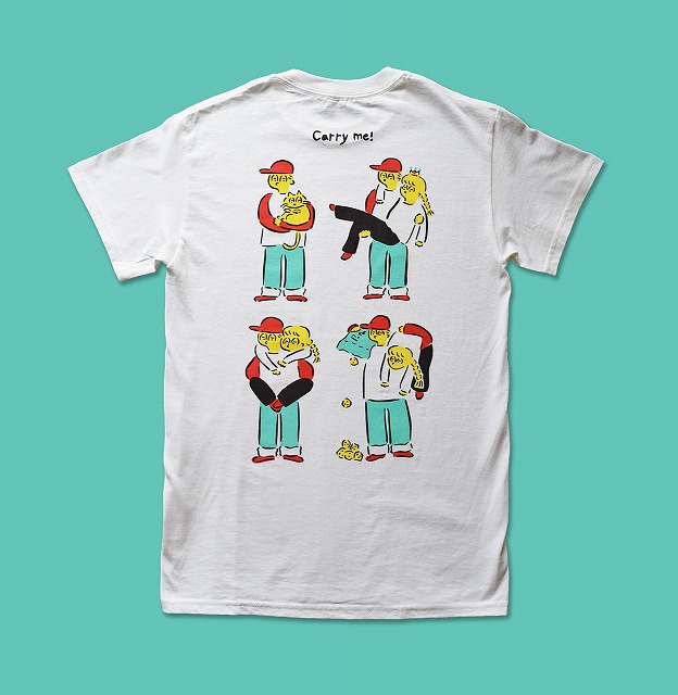 | オススメ商品のこだわりポイント | 背中に配置されたバックプリントに抱っこの一覧のイラストが大きくプリントされています。一枚一枚手刷りでプリントされたオリジナルデザインのTシャツです。 |