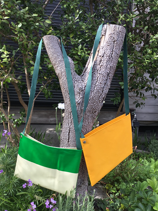 カンボウプラス株式会社の工場でつくられたテント布の生産時にでた端材を使って、バッグを作ります。