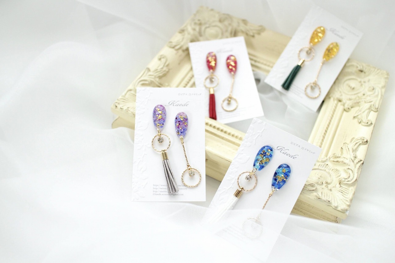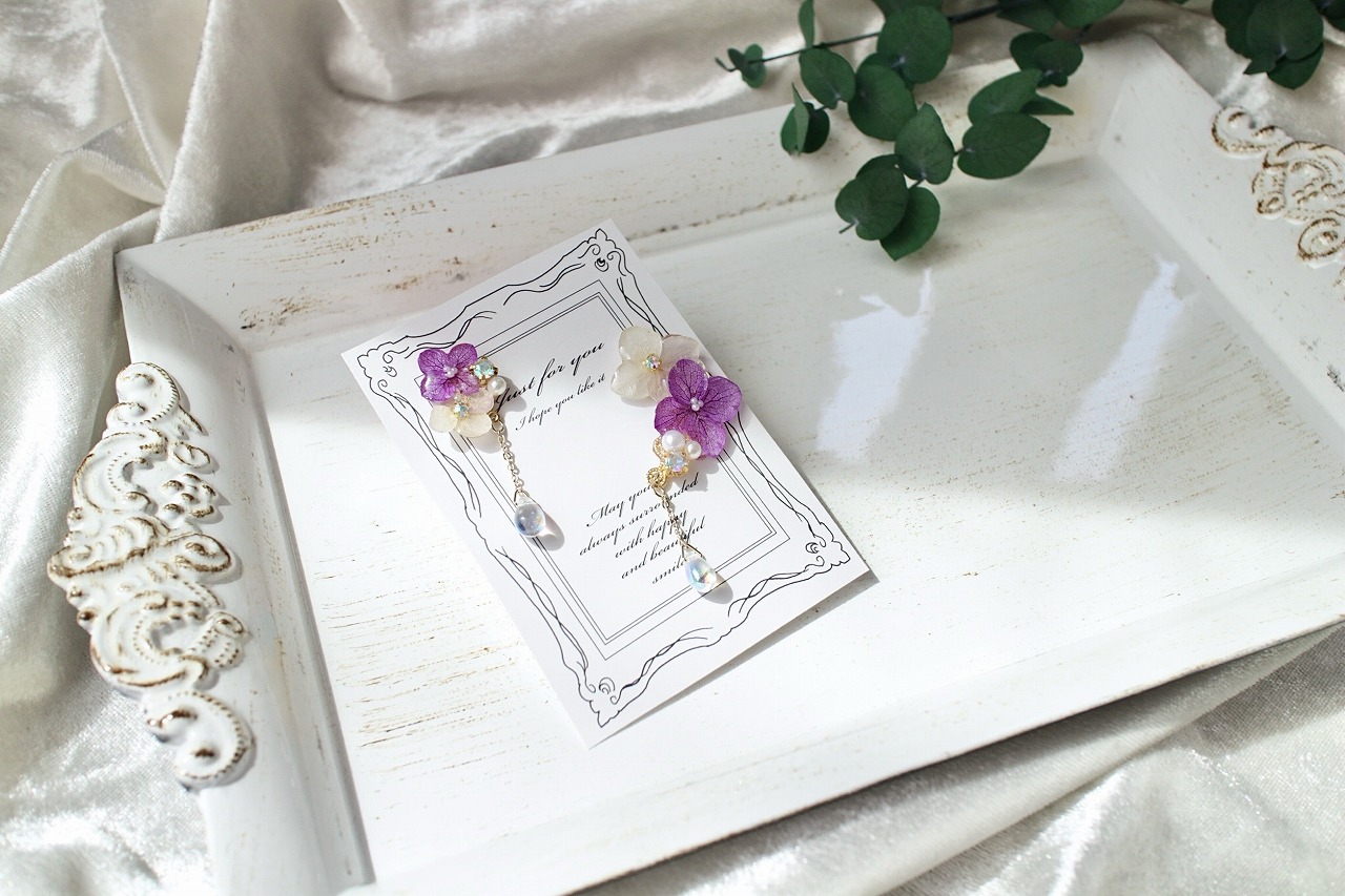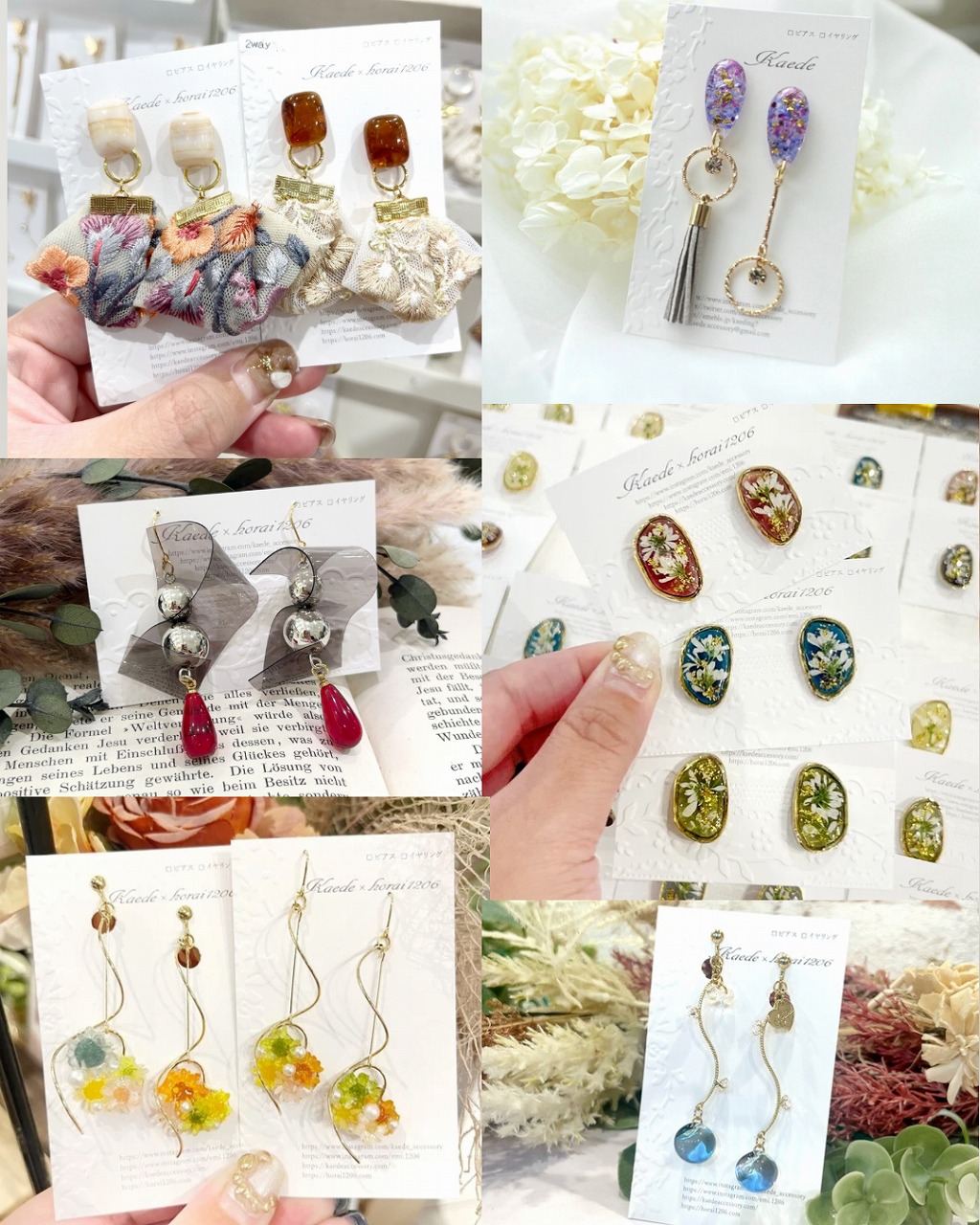 | オススメ商品のこだわりポイント | 全てピアス、イヤリングなどの金具変更が可能でお客様にあった素材をご提案できます。かすみ草や紫陽花などたくさんのお花を使用した春のアクセサリーは毎年とても人気です。 |