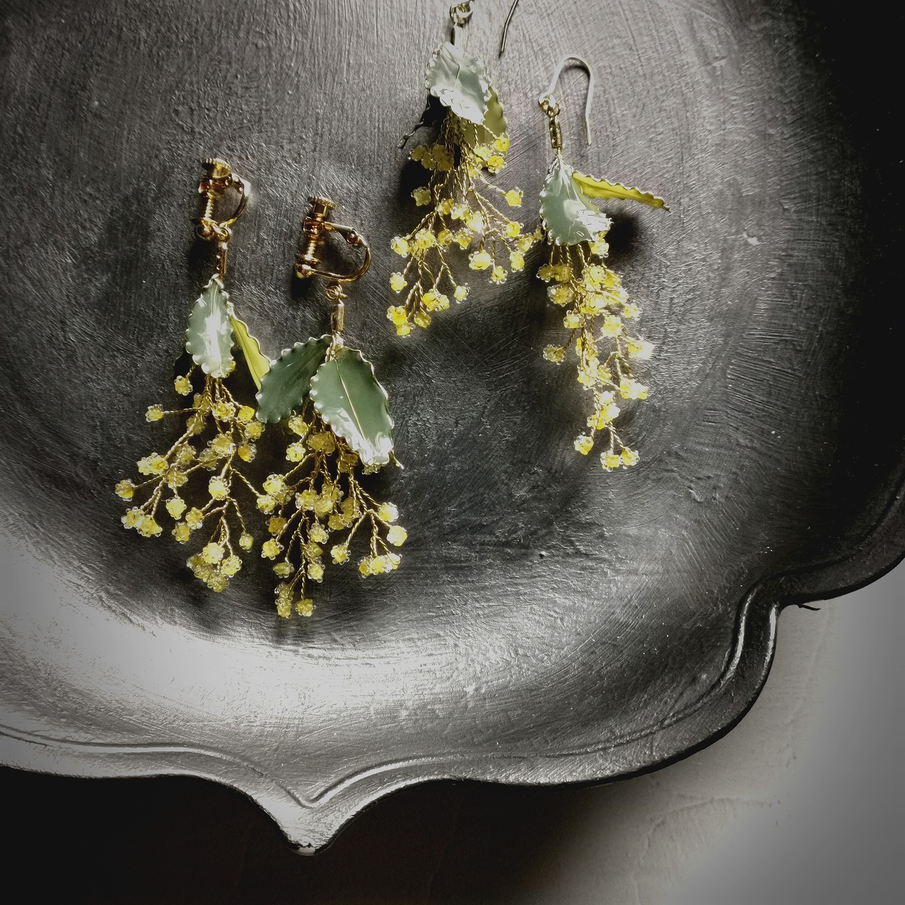| オススメ商品のこだわりポイント | 花、葉ともにワイヤーで形作るミモザの花は既存のパーツを使わず、ヨーロッパなガラスビーズをベースに丁寧にひとつひとつ仕立てています。 |