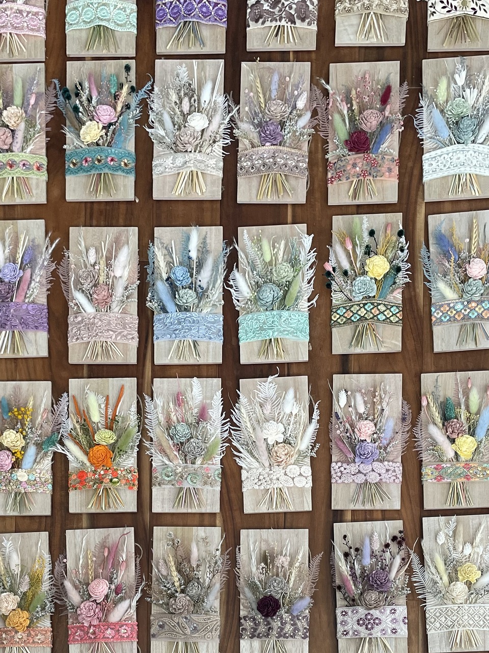 | オススメ商品のこだわりポイント | インド刺繍リボンxお花のオリジナルデザイン。すべて一点もの、天然木の温もりが伝わる特別なフラワーボード。贈り物にもおすすめです。 |