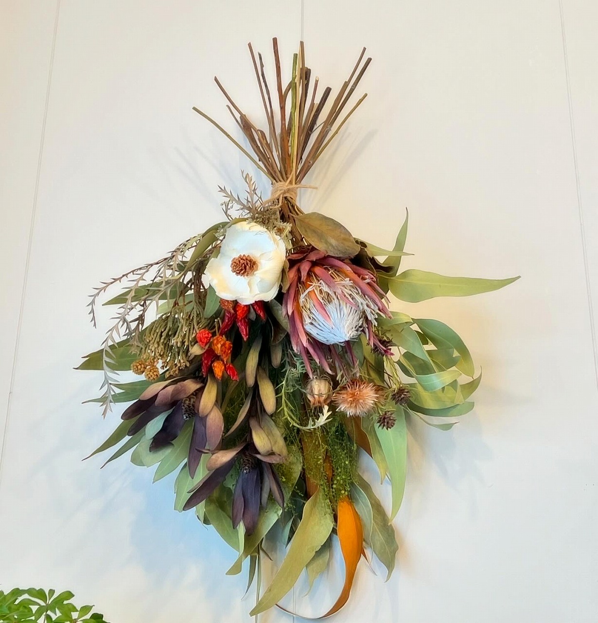 | オススメ商品のこだわりポイント | 1本1本丁寧にドライアップしたドライフラワーを沢山使い、存在感のあるスワッグ(ドライフラワーの壁飾り)にしています |