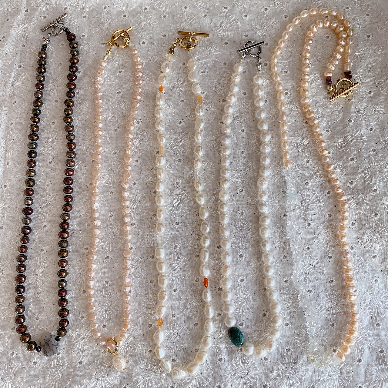 | オススメ商品のこだわりポイント | どんなシーンでも服装でも使いやすいパールのネックレスは色々なパターンで制作しました。色も形も大きさも様々なので、人と被らずどなたでも似合うものを見つけていただけると思います。全てオールノット(仕立てる手法のひとつ)で仕上げています。 |