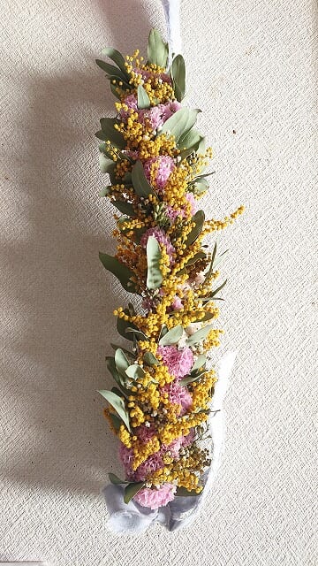 | オススメ商品のこだわりポイント | ミモザとスターチスをたっぷり使ったガーランドです。縦にも横にも飾って頂けます。 |