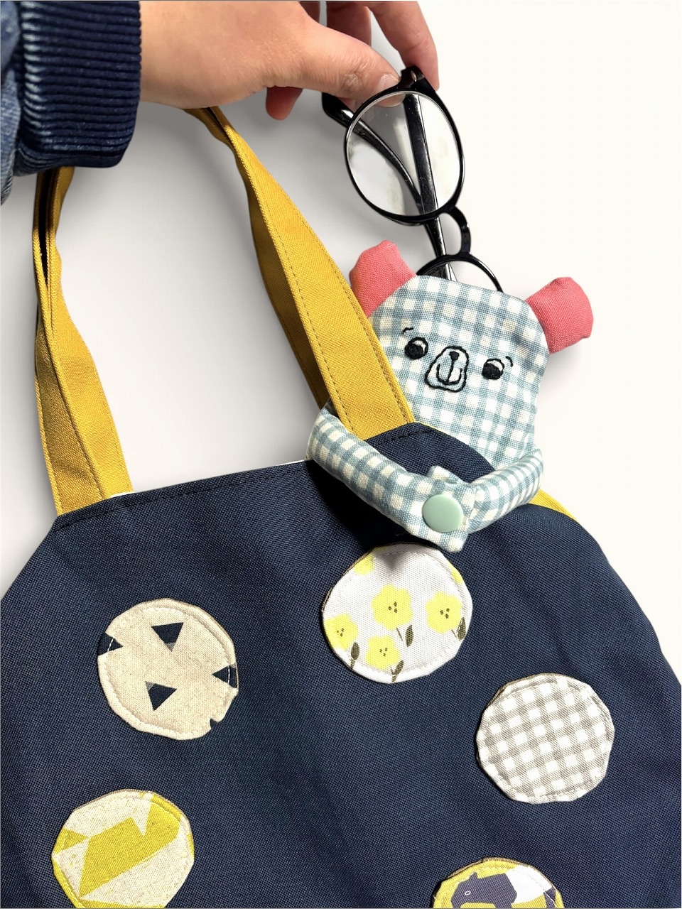| オススメ商品のこだわりポイント | おあぐま眼鏡ケースの耳と手には綿を詰め、本体にはふかふかキルト芯を使用。バッグハンドルに取り付けると、バッグからひょっこり顔を出します。愛嬌のあるお顔は手刺繍です。 |