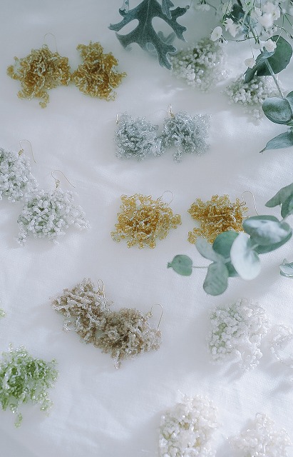 | オススメ商品のこだわりポイント | ビーズでボリュームがしっかりあるのに、とっても軽いところが魅力です。ふわっと華やかに、人と少し違ったアクセサリーをお探しの方にぴったりです。 |