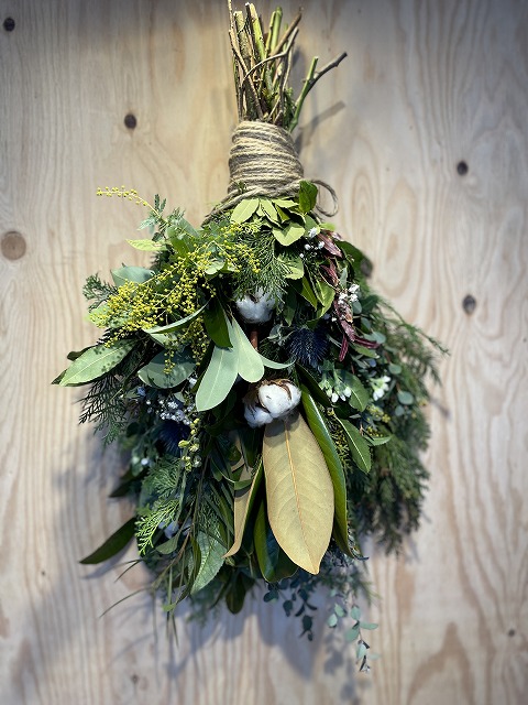 | オススメ商品のこだわりポイント | 地元三重県津市の里山で自家栽培をしている花材をふんだんに使用した朝摘み素材のGreenスワッグを制作して販売します。里山の良さを生かし、ヒノキやスギの葉をベースにして、普通の花屋では扱わないような花材を用いてスワッグを制作します。 |