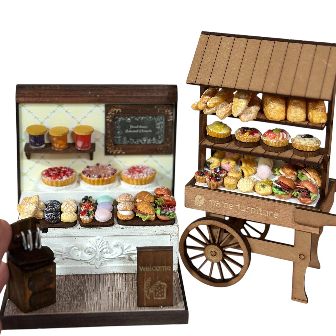 ミニチュアのパンや家具・小物など色々な商品を並べています。是非お手に取ってご覧ください!