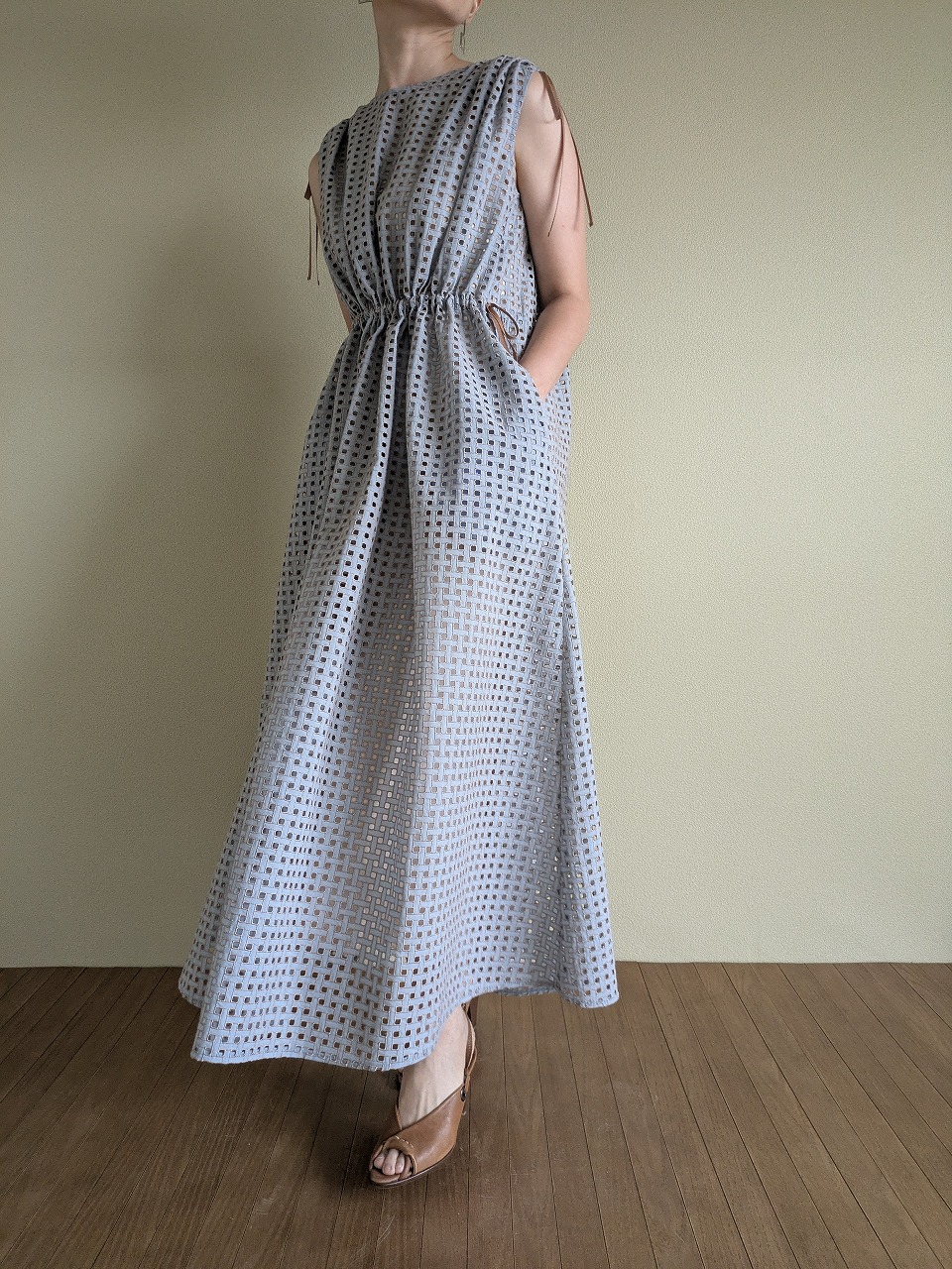 | オススメ商品のこだわりポイント | ペールブルーの生地に×ライトベージュの糸でカットレースが施された少しハリのある素材で仕立てたドレスは、肩とウエスト部分がグログランリボンで長さ調節ができます。お出掛けの時に爽やかな気分になる1枚です。 |