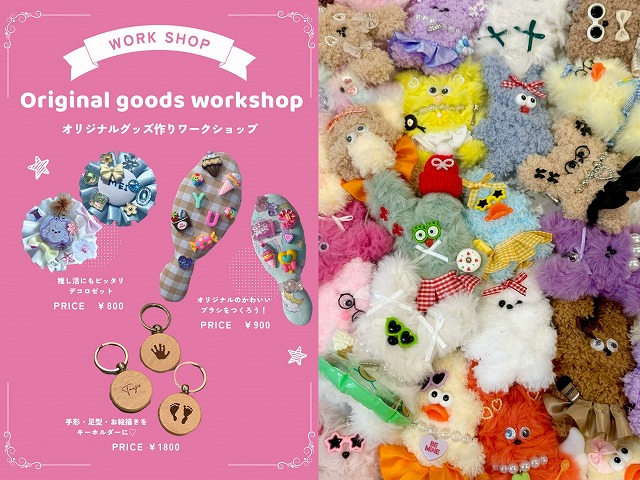 | ワークショップ | モールドール、デコブラシ、ロゼット、オリジナルキーホルダー/・1本のモールから作るフワフワのお人形キーホルダー。こちらで土台となる人形をご準備しますので、お好きなパーツやお洋服を組み合わせていただく簡単に楽しめるワークショップです。・デコブラシ、ロゼット、オリジナルキーホルダーなどのお好きなアイテムからお一つお選びいただき貴方だけのオリジナルグッズを作成します♡/15分/500円~ |