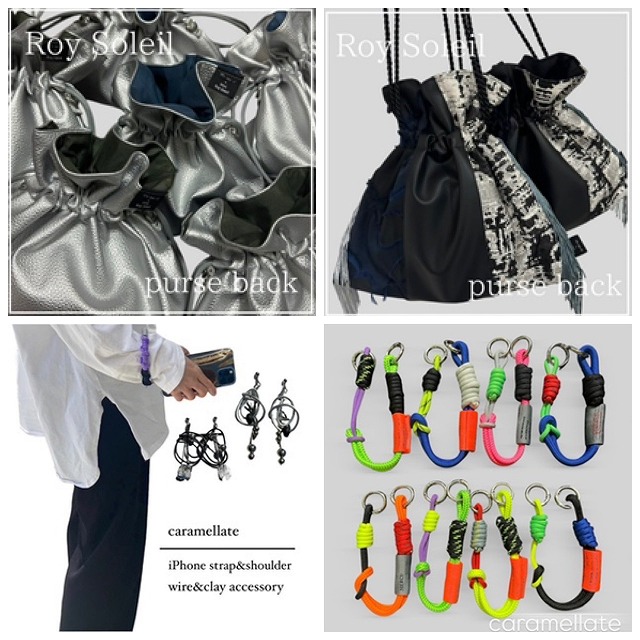 | オススメ商品 | 三色の生地を使ったカバンや靴下、太めのコードを使ったストラップやリメイク服 |