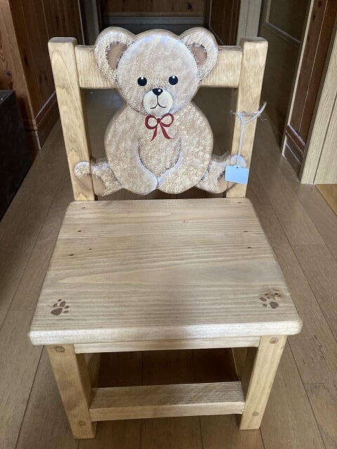 | オススメ商品のこだわりポイント | 天然パイン材を加工してオイルフィニッシュ仕上げ、背板にはクマを切り抜いてトールペイントで絵を描いています。 |