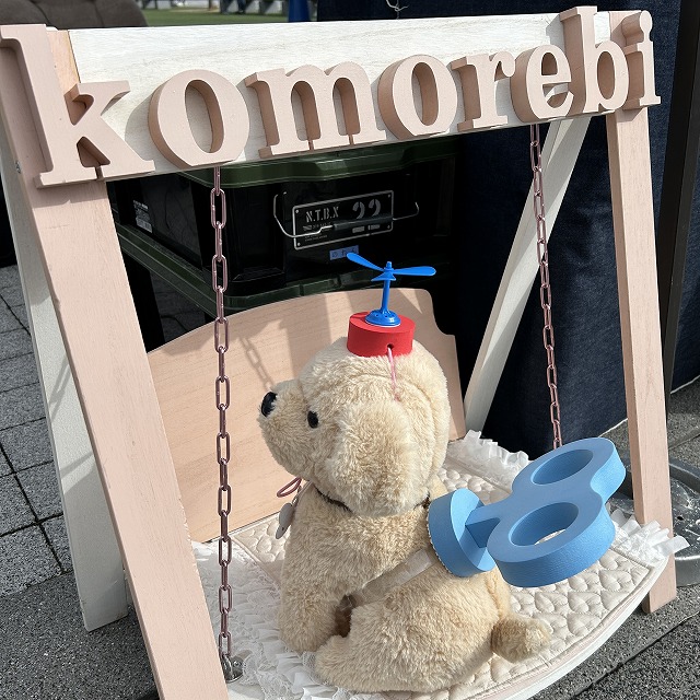 携帯ベンチやハンガーラック、犬のイラストを描いたコースターなどの木工品をはじめ、タケコプターやミツバチなどの頭に乗せる雑貨も販売。また、小さいお子さま用に木の恐竜やシリコン製のスプーンとフォークのセットにお名前を焼き入れる事が出来ますよ。