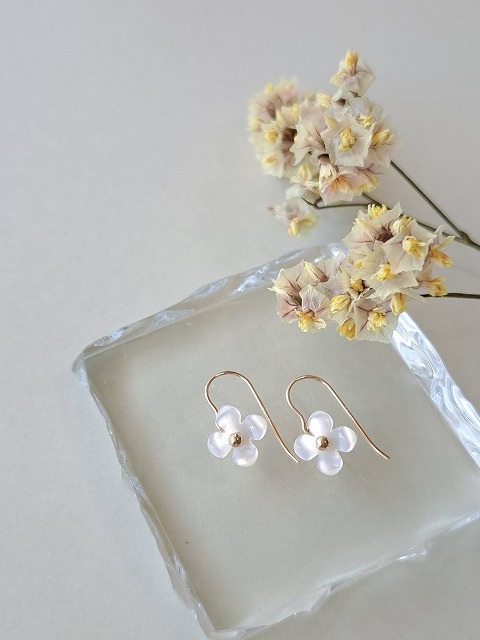 | オススメ商品のこだわりポイント | 小ぶりで上品な印象の、シェル素材を使用したお花型ピアス。自然な艶感と光に透ける繊細さが特徴で、耳元にそっと華やかさを添えてくれます。ナチュラルな素材と上品な輝きが調和した、優しさと女性らしさを感じられるアクセサリーです。 |