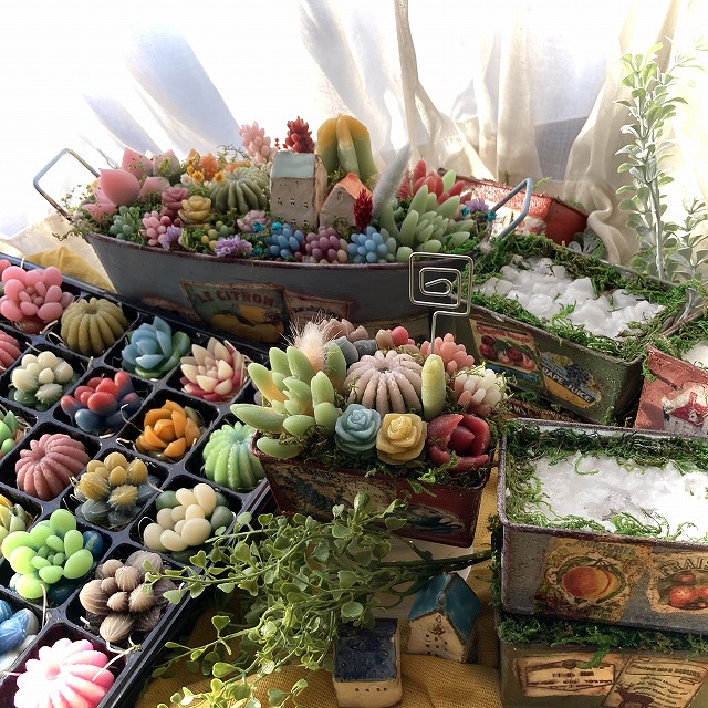 | ワークショップ | 癒しの雑貨つくり/多肉キャンドルの寄せ植え ぷにぷにグミのフルーツソーダフォトスタンドなど/2~30分/1200~1800円 |