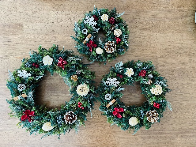 | オススメ商品のこだわりポイント | 毎年人気のプリザーブドフラワー(加工されたグリーン)を使ったクリスマスリースです。グリーンのお色が変わりにくいので、毎年飾っていただけます。今年はどんなデザインのリースが登場するかお楽しみに♪ |