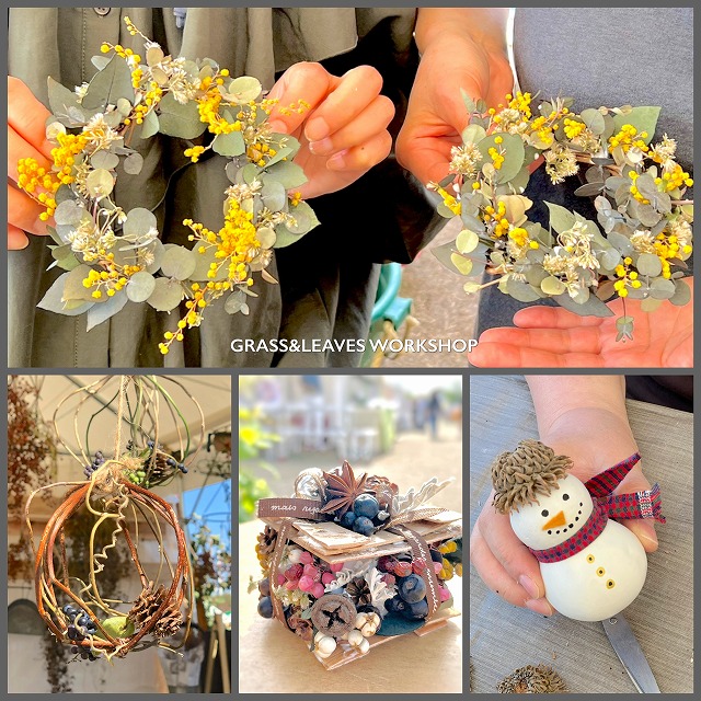 | ワークショップ | ぐらりぶWORKSHOP/ミニボタニカルリース作り(ミニクリスマスリースやミニしめ縄リース等)、三日月リース 等。/30分~1時間/1,000円~ |