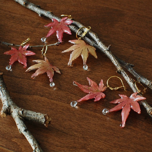 | オススメ商品のこだわりポイント | 色彩の美しい本物の紅葉を樹脂でコーティングしました。雫の中にはキュービックジルコニアを閉じ込め、陽の光で煌めく様子を表現している、カジュアルにも華やかな場面でも使える一品です。 |