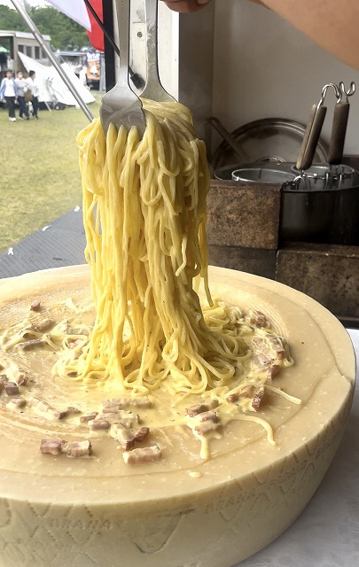 大きなチーズで仕上げるカルボナーラは逸品。ロハスフェスタで是非ご賞味下さい。