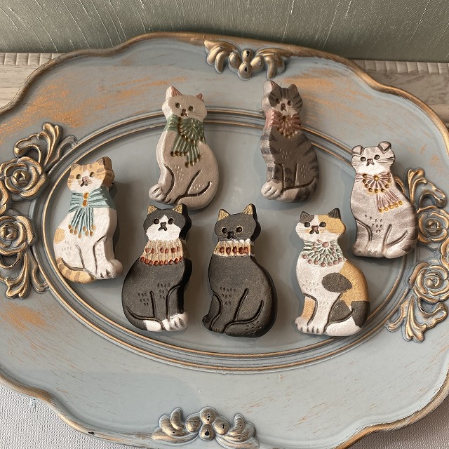| オススメ商品のこだわりポイント | 首飾りを纏い、おすましした姿の猫のブローチです。メタリックカラーで着彩しており、クラシックな雰囲気の猫のブローチは秋冬の装いにおすすめです。 |