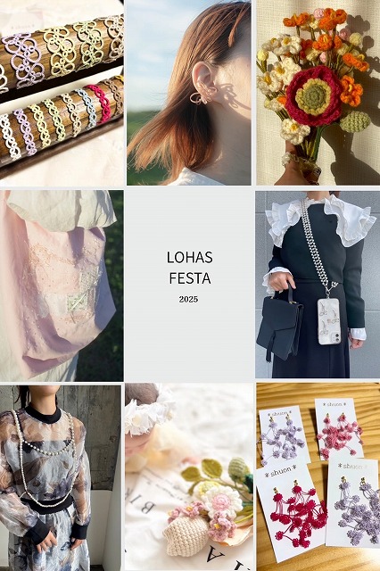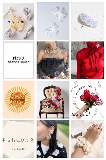 | オススメ商品のこだわりポイント | レース編み、コットンパール、ビーズと刺繍糸を使用したアクセサリーたち、毛糸で編んだお花など、多様な作品たちが並びます。 |