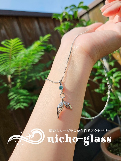 | オススメ商品のこだわりポイント | 繊細で美しい人魚の尾びれはnicho-glass の溶かしシーグラスを配うと最高のアイテムに。身に付けていると物語の情景が浮かびます。 |