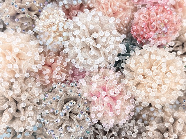 | オススメ商品のこだわりポイント | ビーズとオーガンジーリボンでできた、耳飾りやブローチ、ポニーフックなど。ふわふわの花が咲いたようなアクセサリーです。 |
