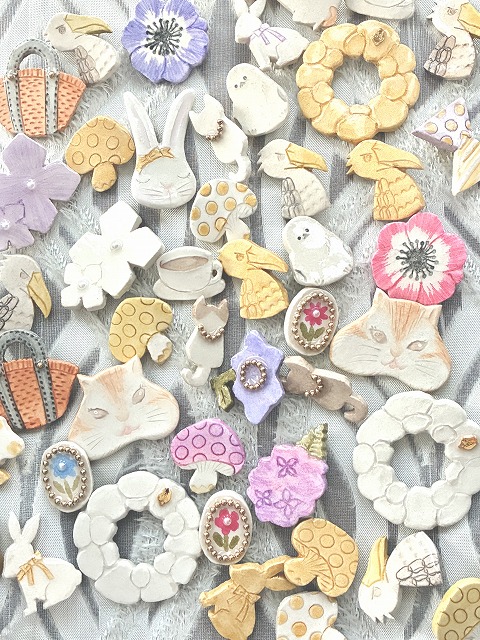 | オススメ商品のこだわりポイント | いくつもの工程を経て作り上げるブローチは、どれも一点もの。少しずつ表情が違い、手づくりならではの良さを、お楽しみください。本体は軽く、生地に負担をかけないのはもちろん、日本製のピンを使用し、生地通りも良いのも、嬉しいポイント! |