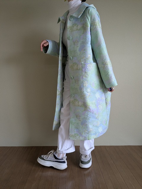 | オススメ商品のこだわりポイント | クリームソーダカラーのジャガード生地を使用したコートです。秋口や春先には1枚で軽く羽織れて、冬場はインナーダウンなどを合わせると長く着ていただけます。一番上の釦をとめると防寒にもなり、外すとお衿っぽくなるフードのデザインがおすすめです。 |