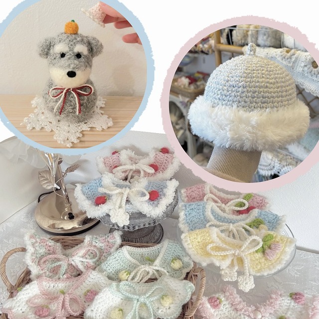 | オススメ商品のこだわりポイント | お子様から大人、ペットまでお洒落を楽しめる商品を取り揃えております。身内7人で制作活動しており、編み物、布小物、木工用品、モールフラワー、ニードル作品など幅広い商品展開となっております。他にはない"かわいい"を詰め込んだお店です。 |