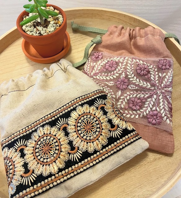 | オススメ商品のこだわりポイント | 天然素材のやさしい風合いと、華やかなインド刺繍がポイントです。裏地仕立てで丈夫な作りで、コスメポーチや小物入れなど、日常使いしやすい商品です。 |