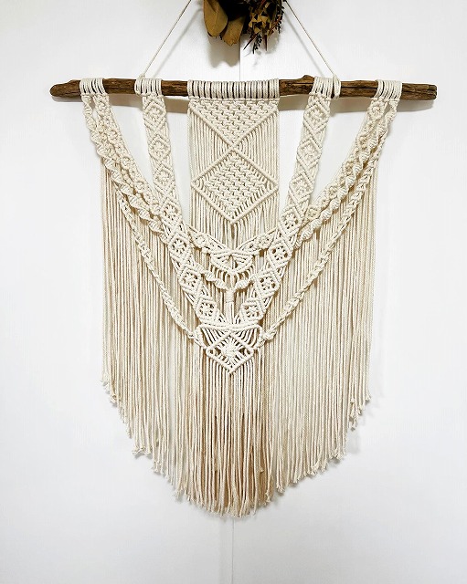 | オススメ商品のこだわりポイント | 地元三重県の天然流木にコットン100%のマクラメロープを使った天然素材のタペストリーです。一目一目、丁寧に手編みで作っています。すべて一点物となるので、お気に入りを見つけて貰えたら嬉しいです。 |