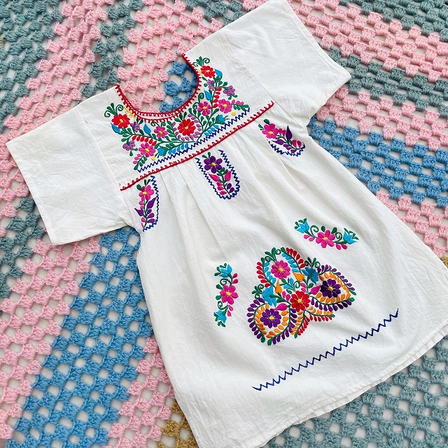 | オススメ商品のこだわりポイント | キッズサイズのメキシコ刺繍ワンピースです。カラフルなお花の刺繍がたっぷりと施された古着ならではなかわいいデザイン。ゆったりとしたシルエットのワンピースなのでお手持ちのお洋服と重ねて着たりする事で幅広いシーズン着て頂けます。 |