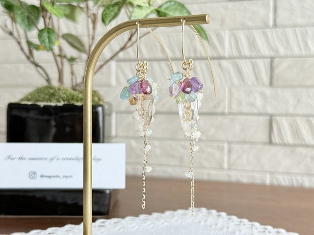 | オススメ商品のこだわりポイント | カラフルな天然石を使用し、気分によって取り外しができるように2wayにお仕立てしています。シンプルな気分の時はカラフルな天然石のチャームを取り外して、1粒ピアスやイヤリングとしてご使用いただけます |