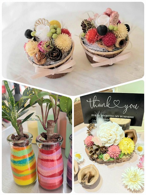 ワークショップ | ・カップケーキフラワー作り・カラーサンド・切り株メモスタンド/・カップケーキの型にお花や木の実を盛り付けてカップケーキ仕上げます。・好きな色砂を重ねて作るカラーサンドアートです。・切り株にお花や木の実をつけてメモスタンドを作ります。/各15分~30分/・カップケーキフラワー 800円・カラーサンド1,000円・切り株メモスタンド1,000円 |